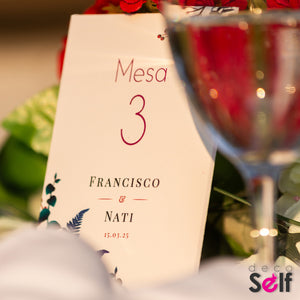 Estos elegantes parantes son perfectos para numerar las mesas o incluir detalles únicos como canciones, frases, lugares o anécdotas que identifiquen a los novios y emocionen a los invitados.