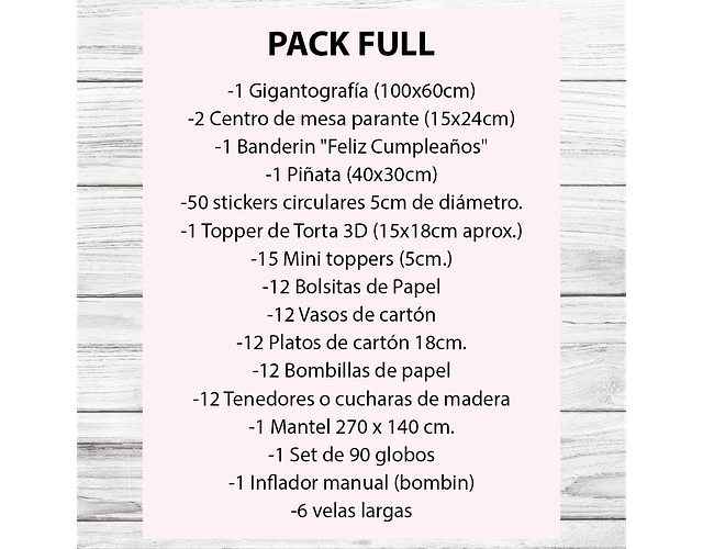 Pack Full x $79.990.- (Pack Básico + Pack Complementario + Pack mesa 12 personas y Globos)