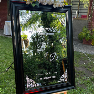 Dale un toque único y elegante a tu matrimonio con nuestro sticker para espejo personalizado, ideal para dar la bienvenida a tus invitados o decorar un rincón especial de tu celebración.